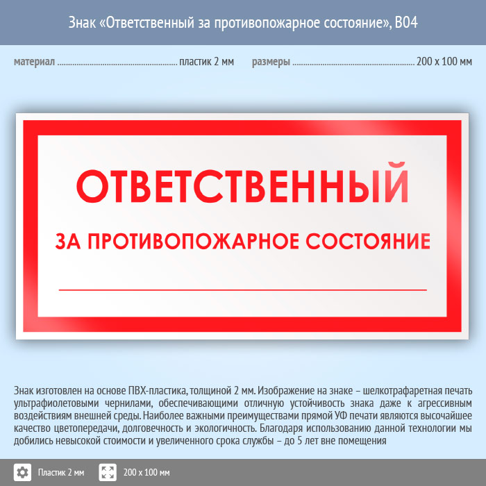 Знак «Ответственный за противопожарное состояние», B04 (пластик, 200х100 мм) в Пензе купить