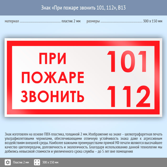 Знак «При пожаре звонить 101, 112», B13 (пластик, 300х150 мм) в Пензе купить