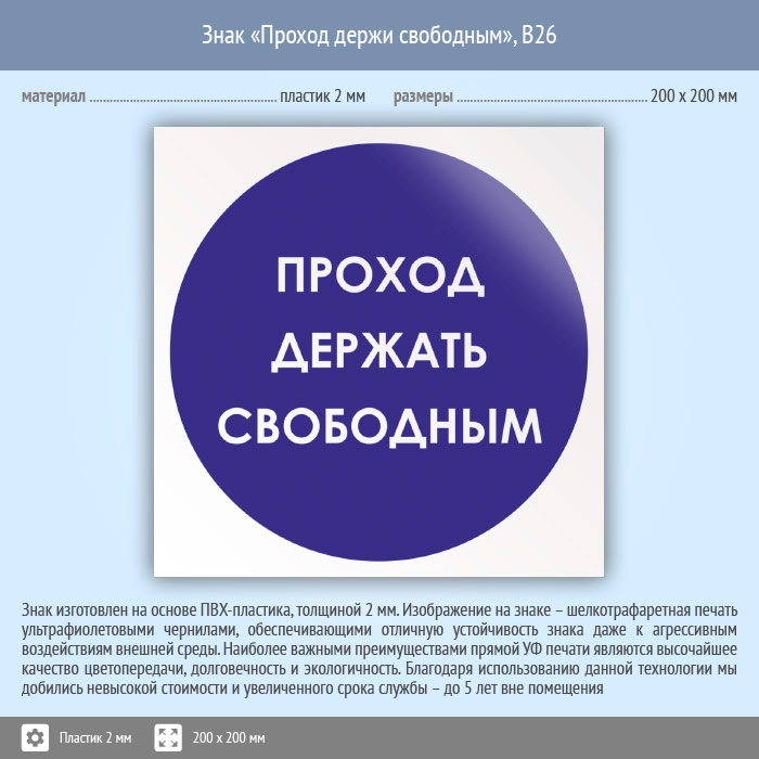 Знак «Проход держи свободным», B26 (пластик, 200х200 мм) в Пензе купить