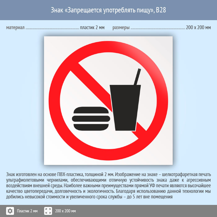 Знак «Запрещается употреблять пищу», B28 (пластик, 200х200 мм) в Пензе купить