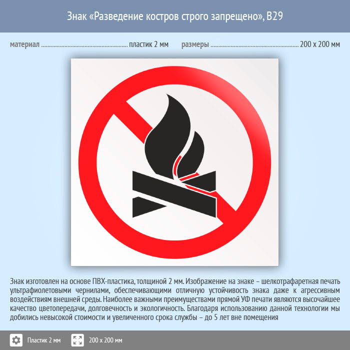 Знак «Разведение костров строго запрещено», B29 (пластик, 200х200 мм) в Пензе купить