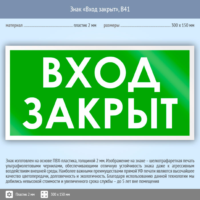 Знак «Вход закрыт», B41 (пластик, 300х150 мм) в Пензе купить