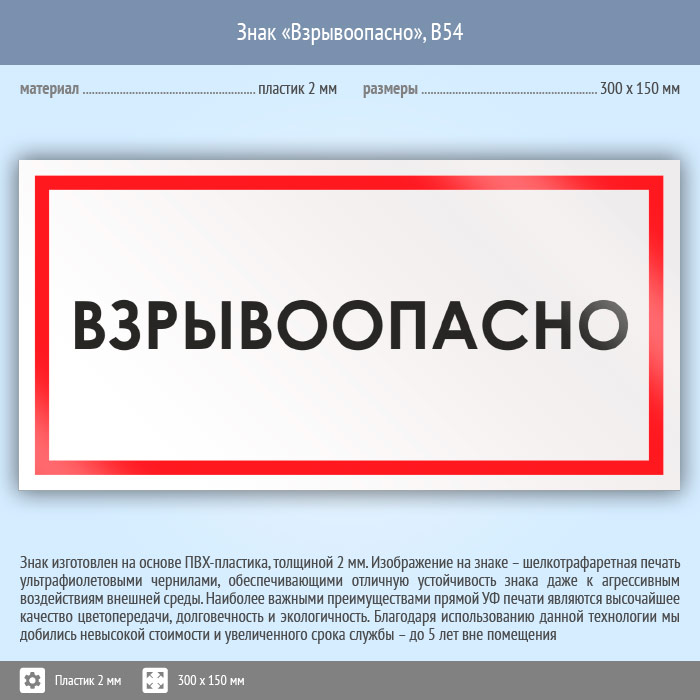 Знак «Взрывоопасно», B54 (пластик, 300х150 мм) в Пензе купить