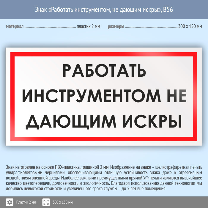 Знак «Работать инструментом, не дающим искры», B56 (пластик, 300х150 мм) в Пензе купить