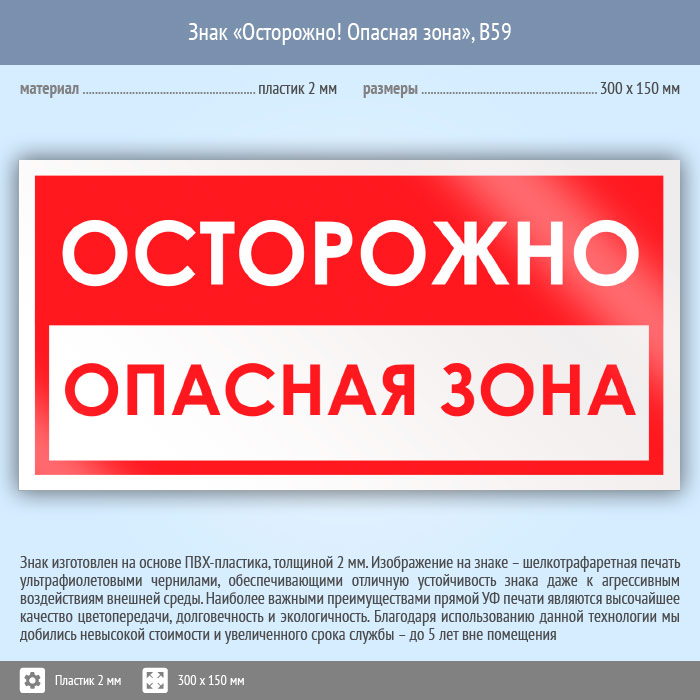 Знак «Осторожно! Опасная зона», B59 (пластик, 300х150 мм) в Пензе купить