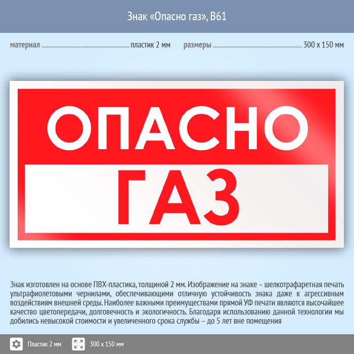 Знак «Опасно газ», B61 (пластик, 300х150 мм) в Пензе купить