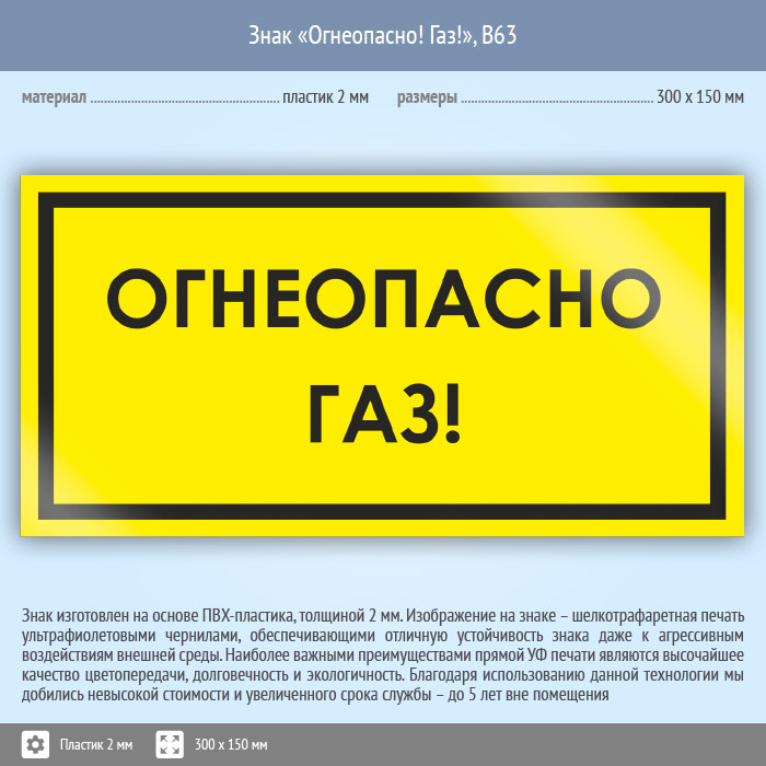 Знак «Огнеопасно! Газ!», B63 (пластик, 300х150 мм) в Пензе купить
