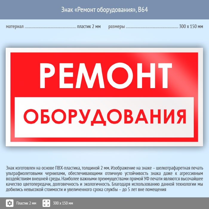 Знак «Ремонт оборудования», B64 (пластик, 300х150 мм) в Пензе купить