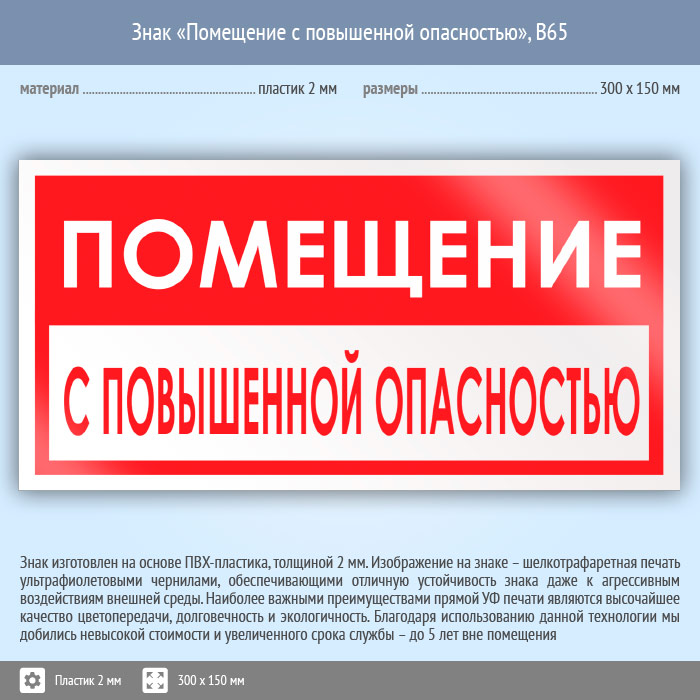 Знак «Помещение с повышенной опасностью», B65 (пластик, 300х150 мм) в Пензе купить