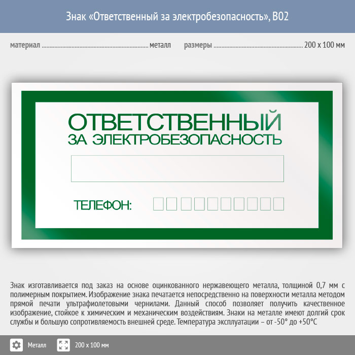 Знак «Ответственный за электробезопасность», B02 (металл, 200х100 мм) в Пензе купить