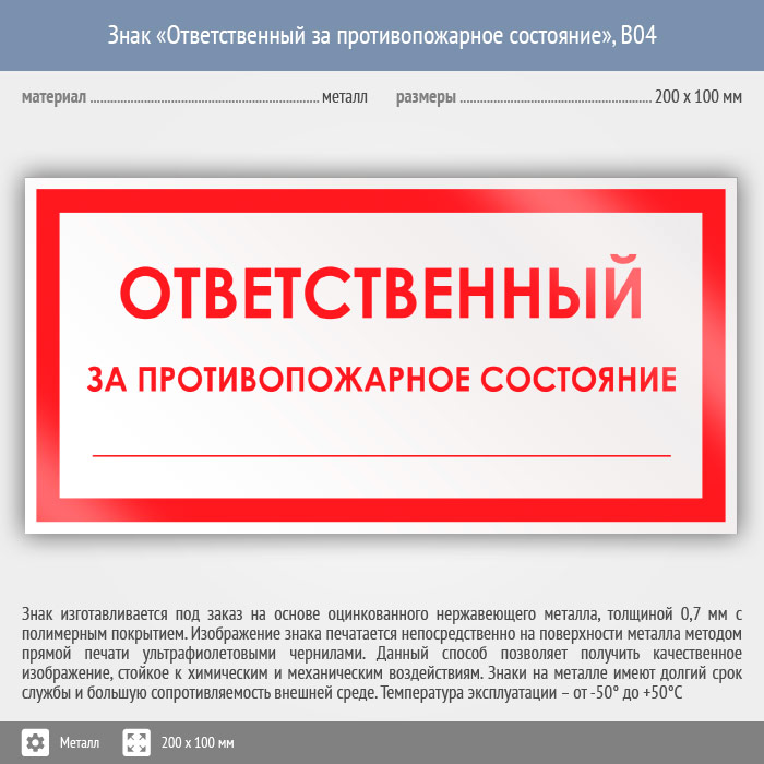 Знак «Ответственный за противопожарное состояние», B04 (металл, 200х100 мм) в Пензе купить