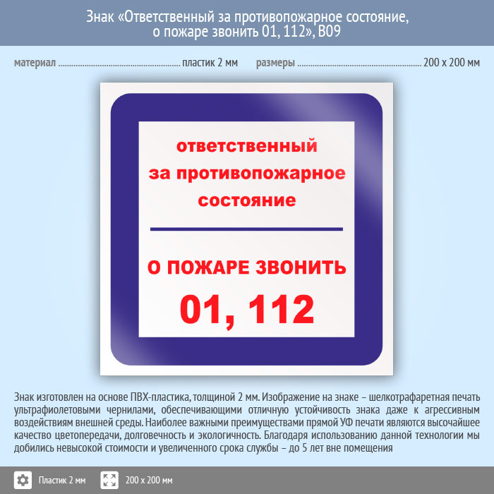 Знак «Ответственный за противопожарное состояние, о пожаре звонить 01, 112», B09 (пластик, 200х200 мм) в Пензе купить