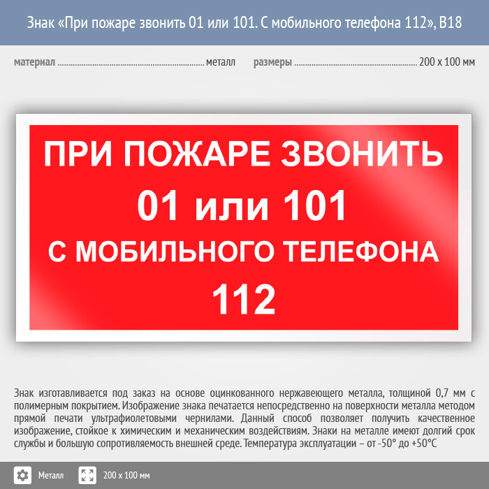Знак «При пожаре звонить 01 или 101. С мобильного телефона 112», B18 (металл, 200х100 мм) в Пензе купить