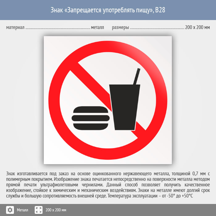 Знак «Запрещается употреблять пищу», B28 (металл, 200х200 мм) в Пензе купить