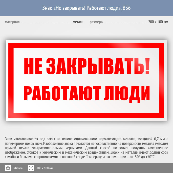 Знак «Не закрывать! Работают люди», B36 (металл, 200х100 мм) в Пензе купить