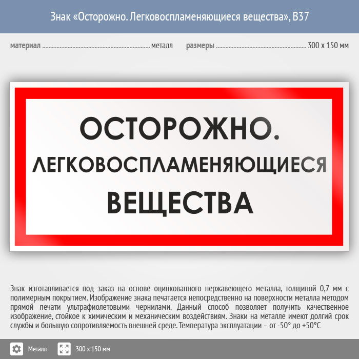 Знак «Осторожно. Легковоспламеняющиеся вещества», B37 (металл, 300х150 мм) в Пензе купить
