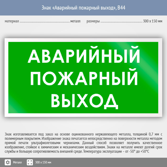Знак «Аварийный пожарный выход», B44 (металл, 300х150 мм) в Пензе купить