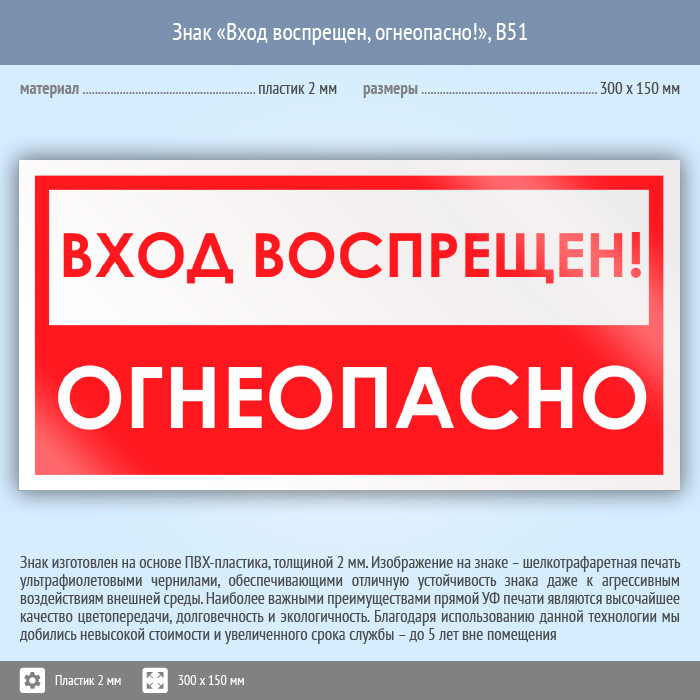 Знак «Вход воспрещен, огнеопасно!», B51 (пластик, 300х150 мм) в Пензе купить