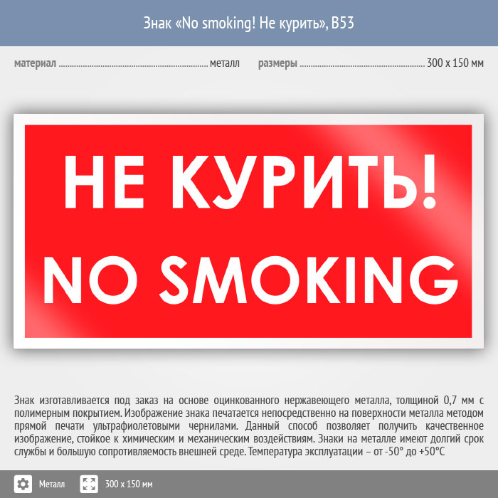 Знак «No smoking! Не курить», B53 (металл, 300х150 мм) в Пензе купить