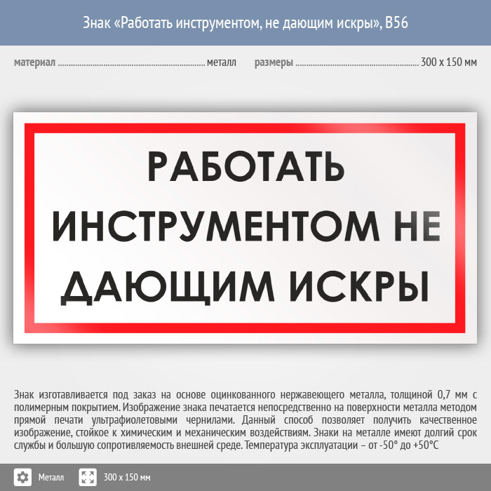 Знак «Работать инструментом, не дающим искры», B56 (металл, 300х150 мм) в Пензе купить