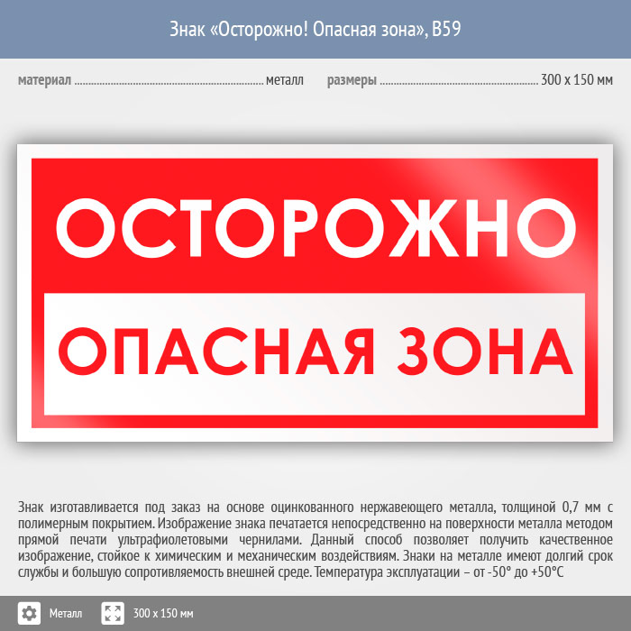 Знак «Осторожно! Опасная зона», B59 (металл, 300х150 мм) в Пензе купить