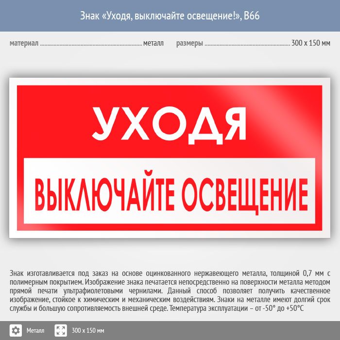Знак «Уходя, выключайте освещение!», B66 (металл, 300х150 мм) в Пензе купить
