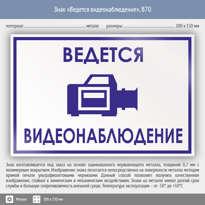 Знак «Ведется видеонаблюдение», B70 (металл, 200х150 мм) в Пензе купить