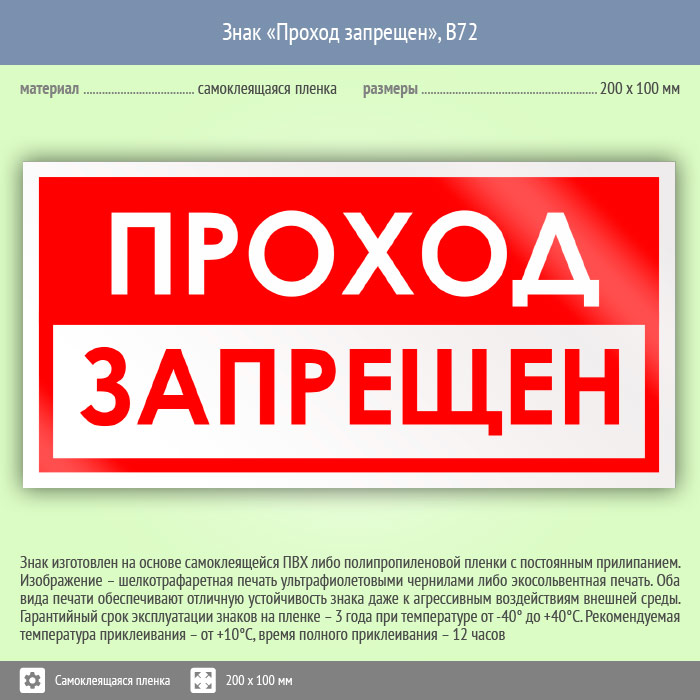 Знак «Проход запрещен», B72 (пленка, 200х100 мм) в Пензе купить