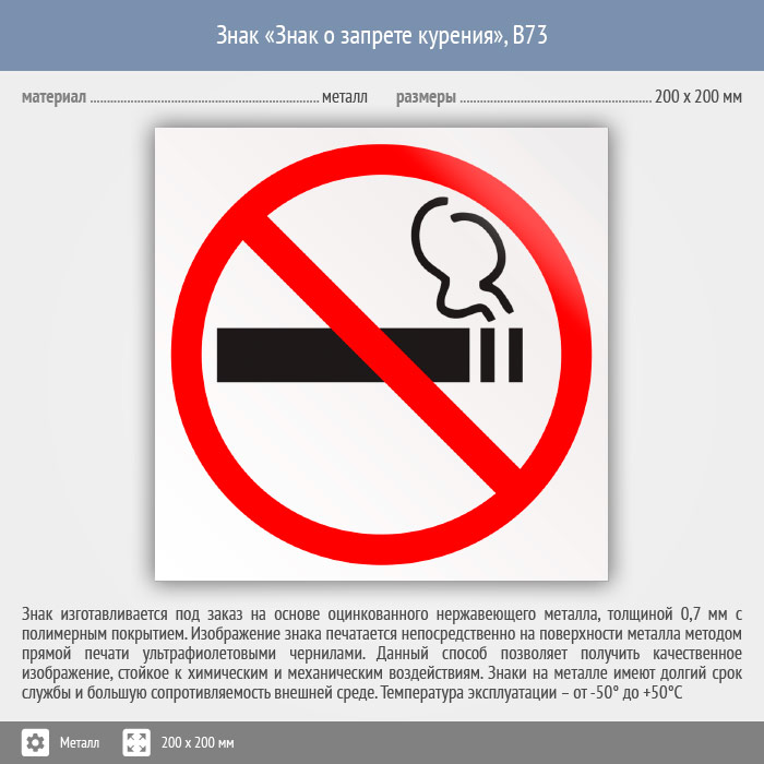 Знак «Знак о запрете курения», B73 (металл, 200х200 мм) в Пензе купить