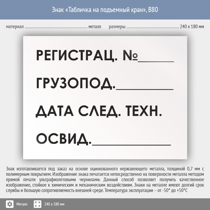 Знак «Табличка на подъемный кран», B80 (металл, 240х180 мм) в Пензе купить