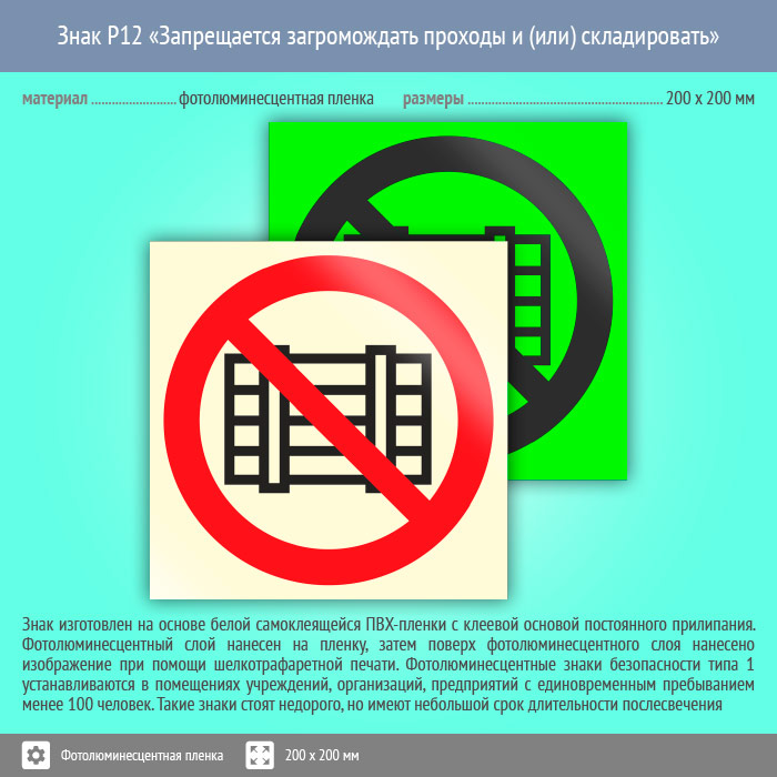 Знак P12 «Запрещается загромождать проходы и (или) складировать» (фотолюминесцентная пленка, 200х200 мм) в Пензе купить