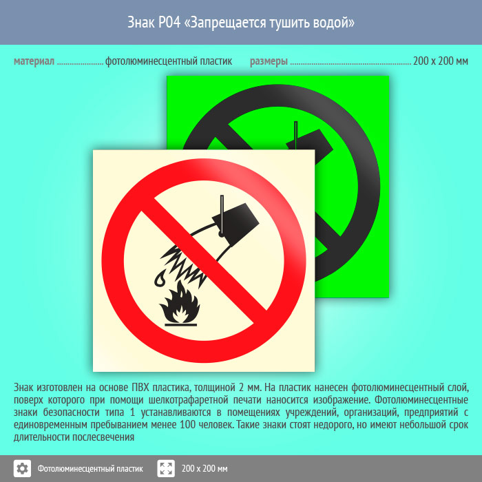 Знак P04 «Запрещается тушить водой» (фотолюминесцентный пластик, 200х200 мм) в Пензе купить