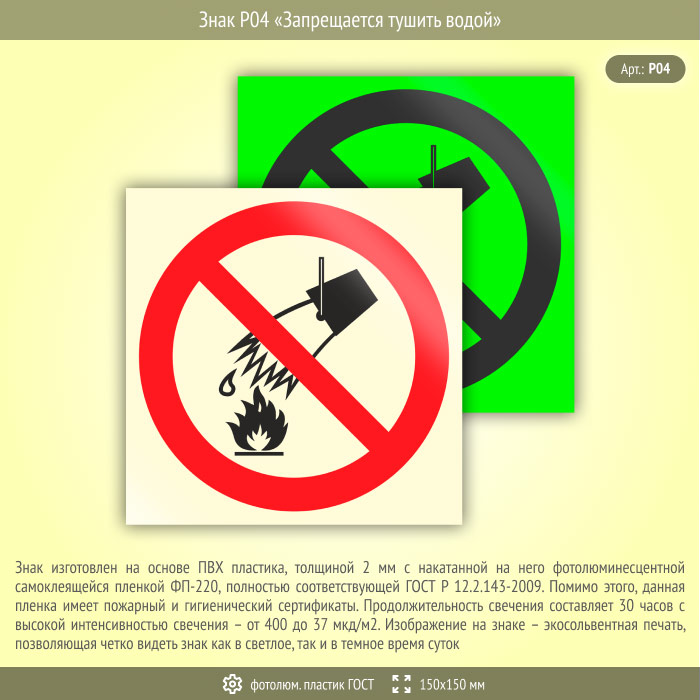 Знак P04 «Запрещается тушить водой» (фотолюминесцентный пластик ГОСТ 34428-2018, 150х150 мм) в Пензе купить