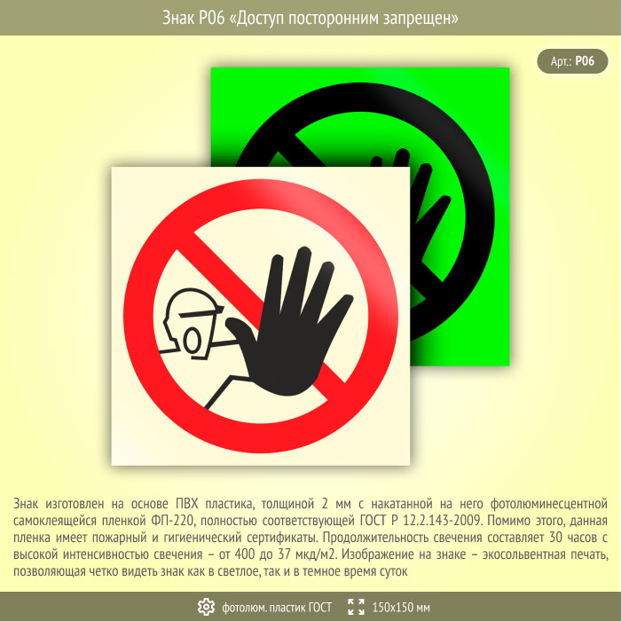 Знак P06 «Доступ посторонним запрещен» (фотолюминесцентный пластик ГОСТ 34428-2018, 150х150 мм) в Пензе купить