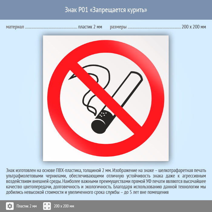 Знак P01 «Запрещается курить» (пластик, 200х200 мм) в Пензе купить