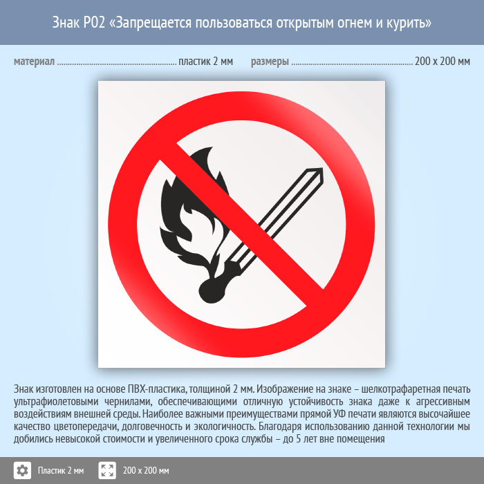 Знак P02 «Запрещается пользоваться открытым огнем и курить» (пластик, 200х200 мм) в Пензе купить