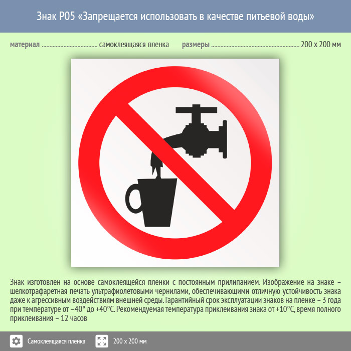 Знак P05 «Запрещается использовать в качестве питьевой воды» (пленка, 200х200 мм) в Пензе купить
