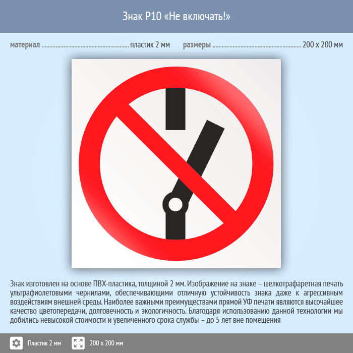Знак P10 «Не включать!» (пластик, 200х200 мм) в Пензе купить