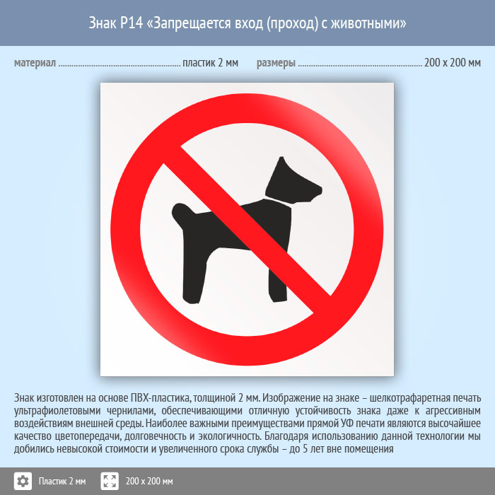 Знак P14 «Запрещается вход (проход) с животными» (пластик, 200х200 мм) в Пензе купить