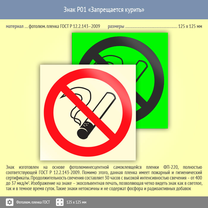 Знак P01 «Запрещается курить» (фотолюминесцентная пленка ГОСТ 34428-2018, 125х125 мм) в Пензе купить