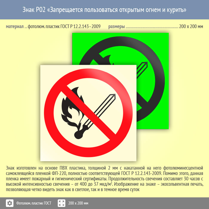 Знак P02 «Запрещается пользоваться открытым огнем и курить» (фотолюминесцентный пластик ГОСТ 34428-2018, 200х200 мм) в Пензе купить