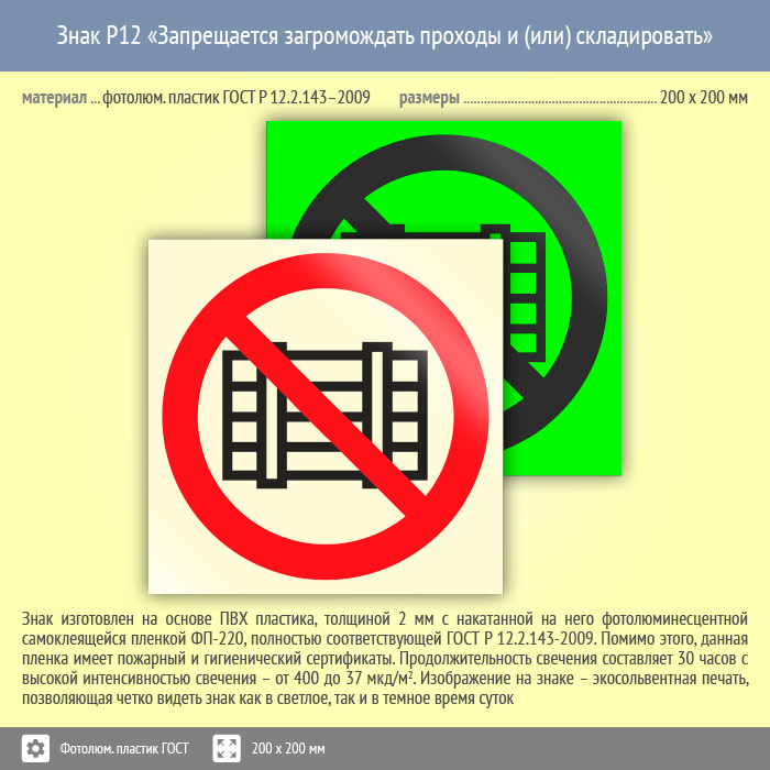 Знак P12 «Запрещается загромождать проходы и (или) складировать» (фотолюминесцентный пластик ГОСТ 34428-2018, 200х200 мм) в Пензе купить