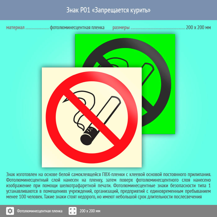 Знак P01 «Запрещается курить» (фотолюминесцентная пленка, 200х200 мм) в Пензе купить