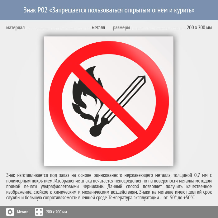 Знак P02 «Запрещается пользоваться открытым огнем и курить» (металл, 200х200 мм) в Пензе купить