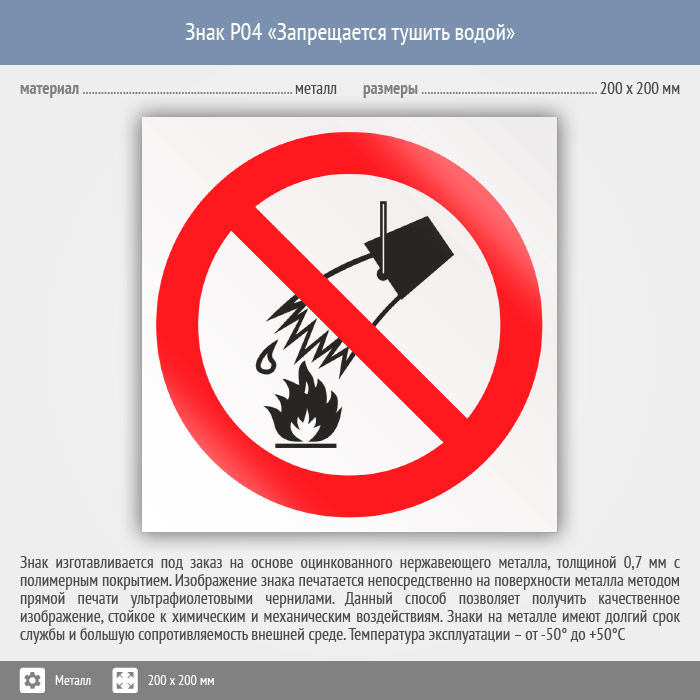 Знак P04 «Запрещается тушить водой» (металл, 200х200 мм) в Пензе купить