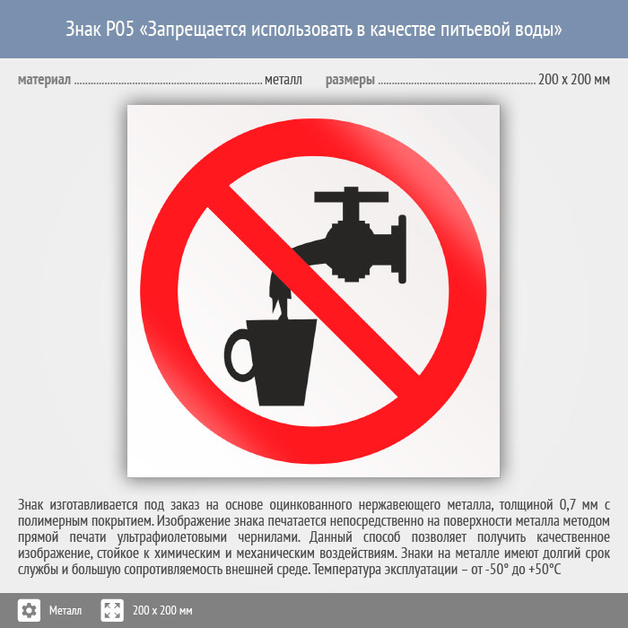 Знак P05 «Запрещается использовать в качестве питьевой воды» (металл, 200х200 мм) в Пензе купить