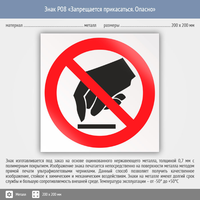 Знак P08 «Запрещается прикасаться. Опасно» (металл, 200х200 мм) в Пензе купить