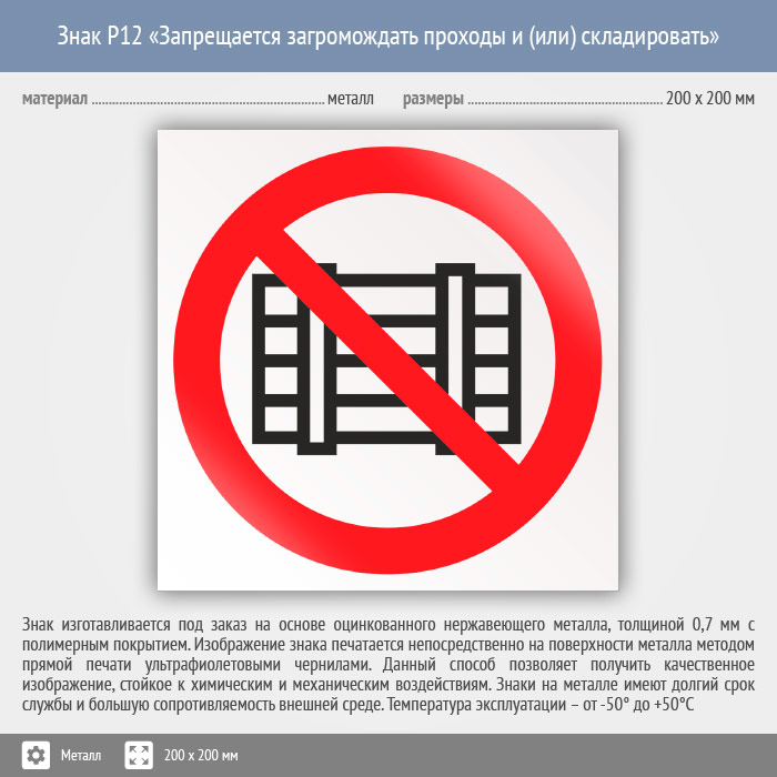 Знак P12 «Запрещается загромождать проходы и (или) складировать» (металл, 200х200 мм) в Пензе купить