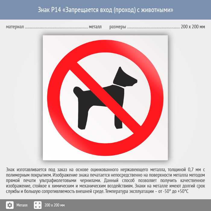 Знак P14 «Запрещается вход (проход) с животными» (металл, 200х200 мм) в Пензе купить