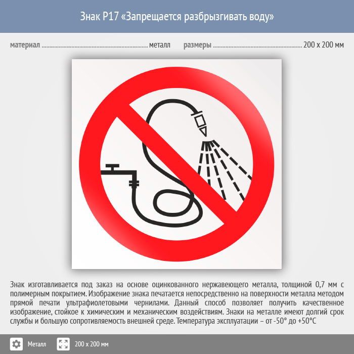 Знак P17 «Запрещается разбрызгивать воду» (металл, 200х200 мм) в Пензе купить